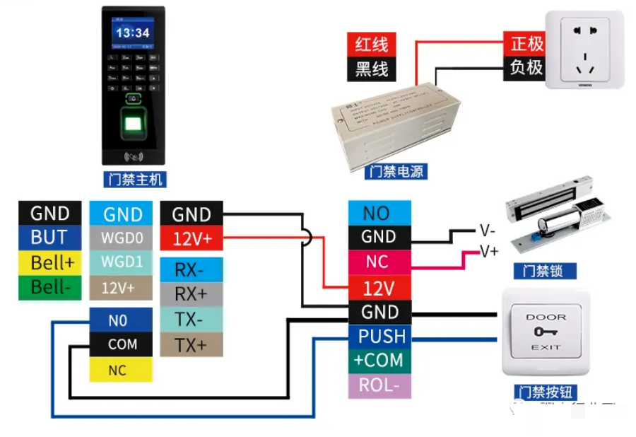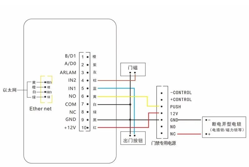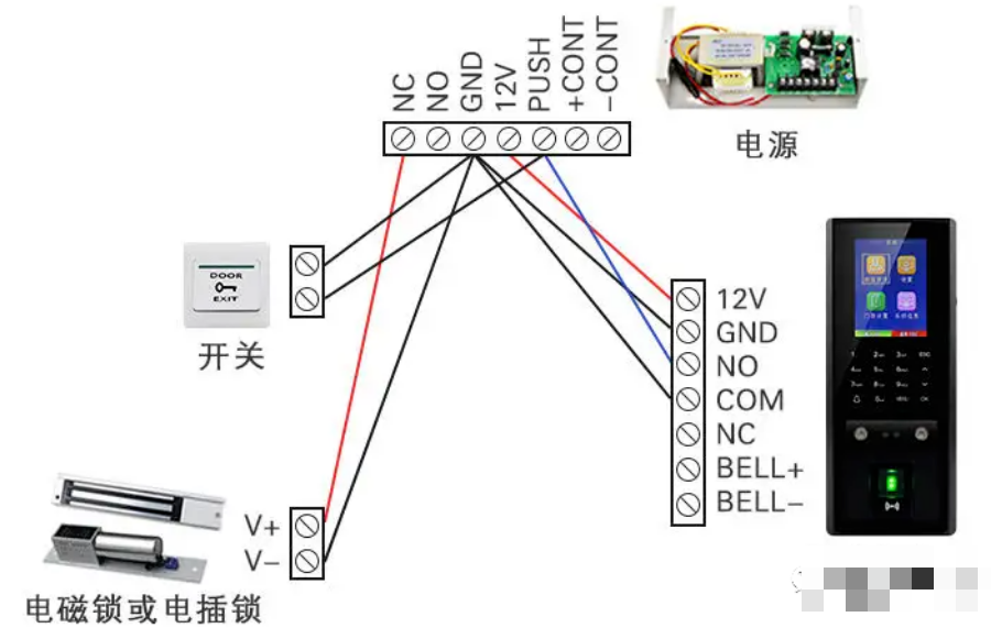 1、先接设备电源,将门禁一体机的10P(或8P)端子线的电源正级(红线V,电源负极(黑线)接到电源箱的GND。 2、接开锁信号,将门禁一体机端子线的继电器公共端COM(白线)接到电源箱的GND,也便是说将COM与GND短接;继电器常开NO(黄线)接到电源箱的PUSH,若电源箱有两个PUSH,则接到第一个PUSH,标识为PUSH1或PUSH2。 电插锁与磁力锁线接都相同,电锁的赤色线接到电源箱的NC,电锁的黑色线接到电源箱的GND。若电锁无红黑线则不区别正负极。 将门禁设备的出门按钮IN1(蓝线),接到出门按钮一端,出门按钮另一端,用一根独自的线接到GND。 出门按钮还有另一种接法:按钮端的线,不接扫码门禁设备,直接接到门禁电源的PUSH,另一端仍是GND,此种接法的优势是:门禁设备拆开后,运用按钮还能开门。出门按钮的接线,不区别正负极。 留意:门禁设备端子线,其它不运用的线,逐根用电工胶布包好。现在通电进行测验。 若门禁设备不需要网络则疏忽这一步。将门禁设备四芯端子线按如图所示接好,端子刺进设备。 12接12V,负极(黑线)接gnd,公共端接(com)接gnd,常开(no)接push,最终便是这张图: 近期发布了2021-2022年的大众号文章。里边有明争暗斗,有图片,根本涵盖了智能化弱电职业的各个体系的文章,精品材料,每一篇都带着项目名称,便利我们查找相关联的内容。此材料很合适新人学习,特别没时间、又不知道怎么查找材料的,主张弄一套,许多类型明争暗斗,肯定有协助! 文章中的PPT明争暗斗,合计170个PPT,最全完好体系图集,职业标准规范及施工图集,word文档,施工组织设计,工程量清单,图纸以及材料,VISIO图块以及拓扑图,项目办理及施行工程的明争暗斗,带报价的工程量清单,招标明争暗斗及施工组织设计等等。 点击下方检查:2021年-2022年材料汇总,晋级最新材料明争暗斗,赠送多个最新弱电材料 我是作者弱电林总,一位弱电经营者。现首要训练,智能化职业开展的新趋势,业余时间运营这个大众号。 如要参加弱电职业微信免去群,请加弱电微信老友P,老友请求注明“弱电智能化”,并附“公司+集体